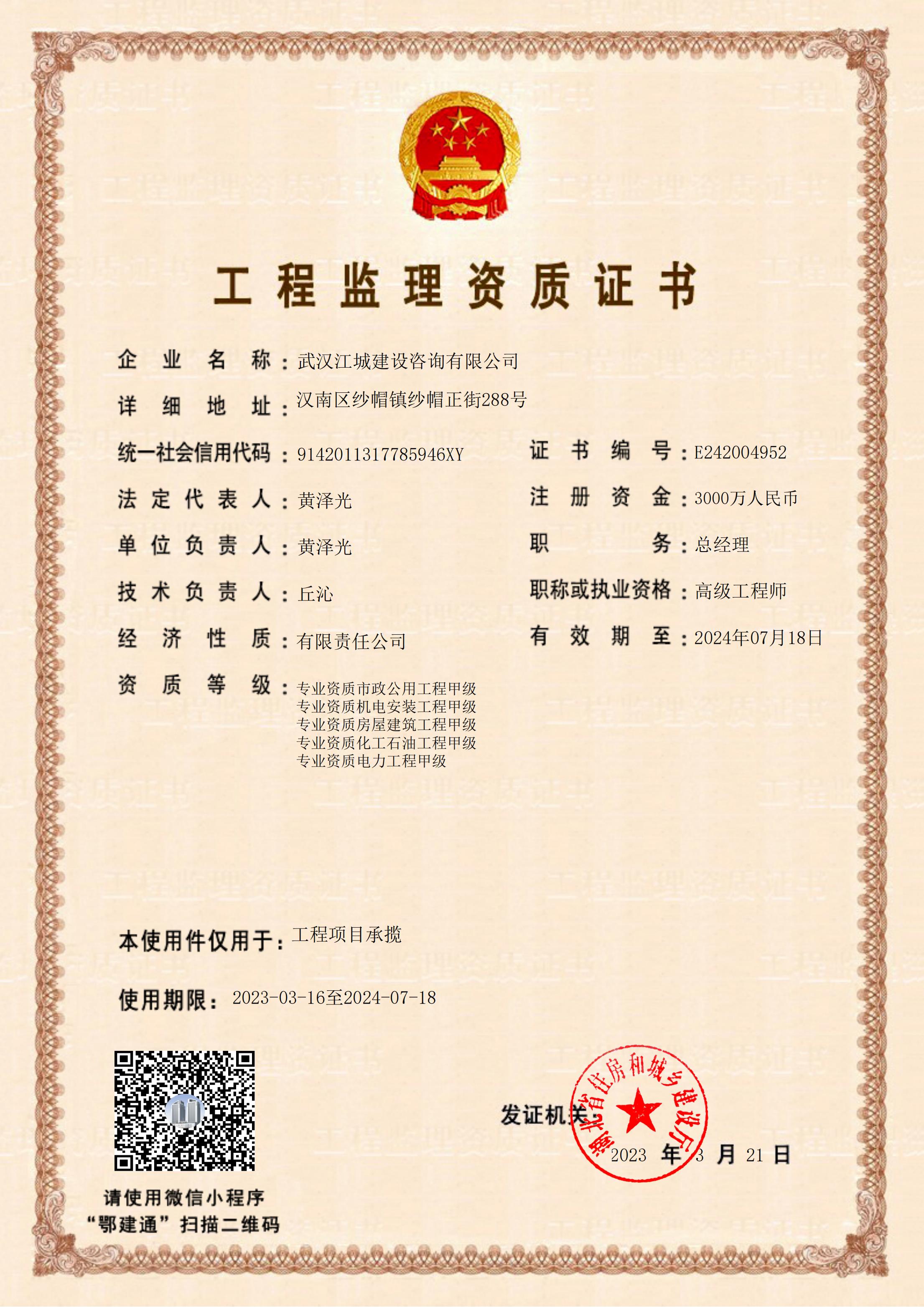 2023年3月17日,湖北省住房和城鄉(xiāng)建設(shè)廳公布了核準(zhǔn)的工程監(jiān)理企業(yè)資質(zhì)——武漢江城建設(shè)咨詢有限公司(以下簡(jiǎn)稱“武漢江城”)獲電力、化工石油專業(yè)甲級(jí)資質(zhì),形成了具備房建、市政、機(jī)電、電力、化工石油五項(xiàng)甲級(jí)資質(zhì)的“新江城”?!靶陆恰睂⒁怎謪枈^發(fā)、篤行不怠的姿態(tài)勇毅前行,力行盡快申請(qǐng)到綜合級(jí)監(jiān)理資質(zhì),屆時(shí)武漢江城將會(huì)以監(jiān)理為契機(jī),重組相關(guān)設(shè)計(jì)資質(zhì),努力為開拓發(fā)展全過程工程咨詢服務(wù)創(chuàng)造條件。